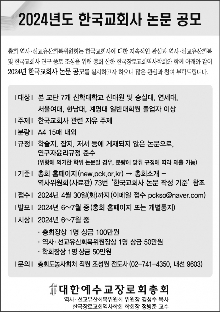 총회 역사·선교유산회복위원회는 한국교회사에 대한 지속적인 관심과 역사·선교유산회복 및 한국교회사 연구 풍토 조성을 위해 총회산하 한국장로교회역사학회와 함께 아래와 같이 2024년 한국교회사 논문 공모를 실시하고자 하오니 많은 관심과 참여 부탁드립니다.