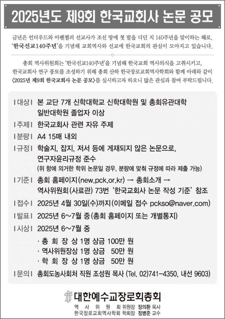 총회 역사위원회는 ‘한국선교140주년’을 기념해 한국교회 역사의식을 고취시키고, 한국교회사 연구 풍토를 조성하기 위해 총회 산하 한국장로교회역사학회와 함께 아래와 같이 <2025년 제9회 한국교회사 논문 공모>를 실시하고자 하오니 많은 관심과 참여 부탁드립니다.