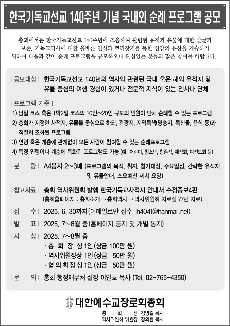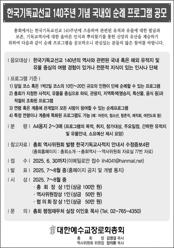 한국기독교선교 140주년 기념 국내외 순례 프로그램 공모