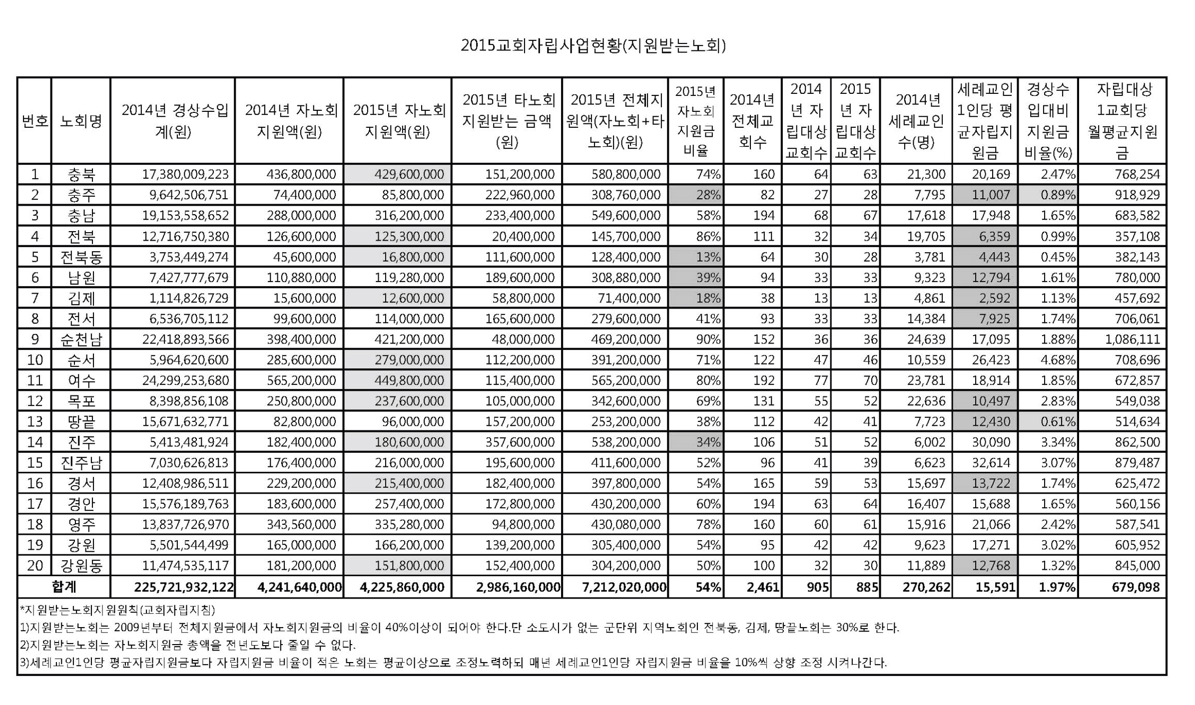 2015년 교회자립사업현황(지원받는노회) 입니다.
