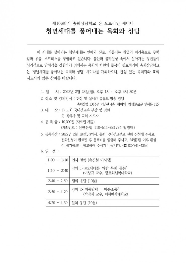 제106회기 총회 상담학교 세미나 청년세대를 품어내는 목회와 상담