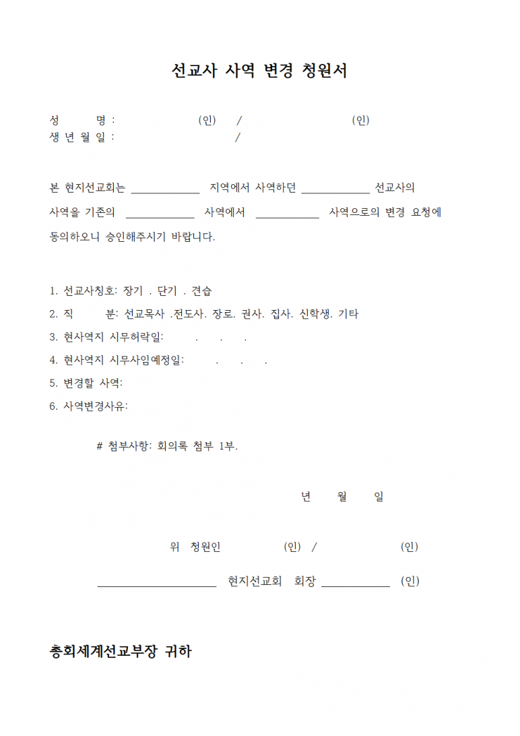 [행정] 선교 사역 변경 청원서