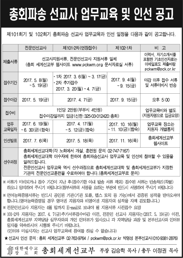 *인선발표: 2017. 7. 6.(목) 총회세계선교부 웹사이트에서 확인