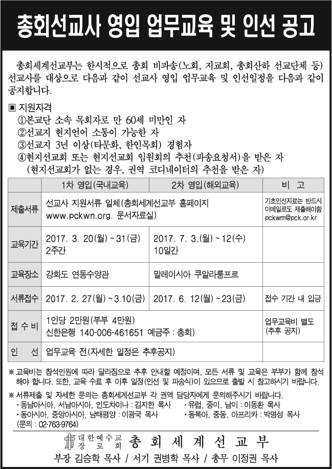 세계선교부대한예수교장로회총회의 세계선교 행정업무를 담당하는 부서입니다.