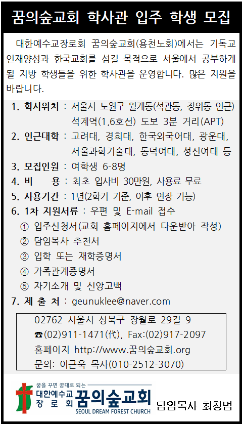 꿈의숲교회에서 4월 5일 부터 학사관을 오픈하게 되었습니다.