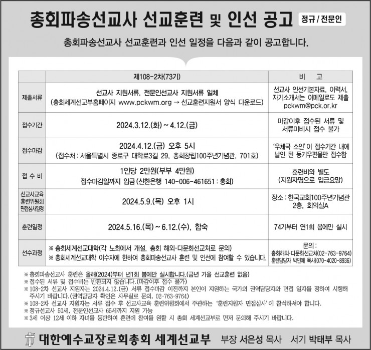 제108-2차(73기) 총회파송선교사 선교훈련 안내
