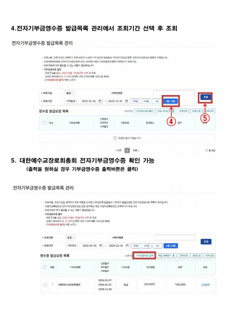 2026년부터 기부금 영수증 발급 제도가 변경됨에 따라, 국세청 홈택스(www.hometax.go.kr)를 통해 직접 확인 및 출력하셔야 합니다. 자세한 내용은 첨부된 안내 파일을 참고하여 순서에 따라 진행해 주시기 바랍니다. 여러분의 양해와 협조에 감사드립니다. |