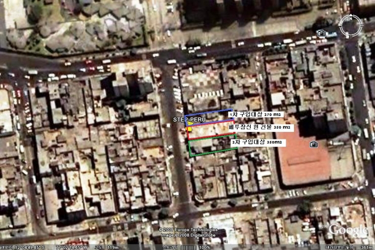 주님의 인도하심으로, 저희 신학교는 리마의 중심지역에 자리를 잡았고, 신학교와 담장을 같이하는 두 주택이 모두 구입이 가능합니다. 현재의 신학교 대지는 350 m2 이며, 인접 두 주택은 각각 270 m2 , 350 m2 이어서, 두 주택을 구입하면 신학교 대지는 970 m2가 됩니다.신학교 주변 구글 사진, 붉은 선이 현 신학교 건물, 위 아래의 청색 및 녹색 선 안이 구입 대상 건물.