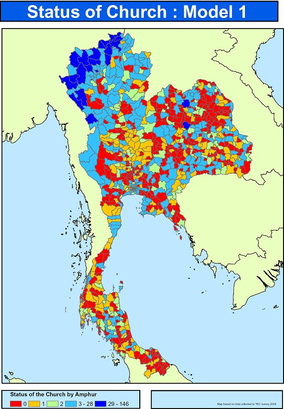 태국 지도에각 군단위를 표시하고군단위별로 교회수를 파악하여색깔로 표시한 지도입니다.2004년도에 정확한 조사를 실시하여2010년까지 무교회 군단위에 우선적으로 교회를 개척하자는 초교파적인 개신교 연합회의 프로젝트입니다비젼2010붉은색 지역이 무교회 군단위 지역입니다.