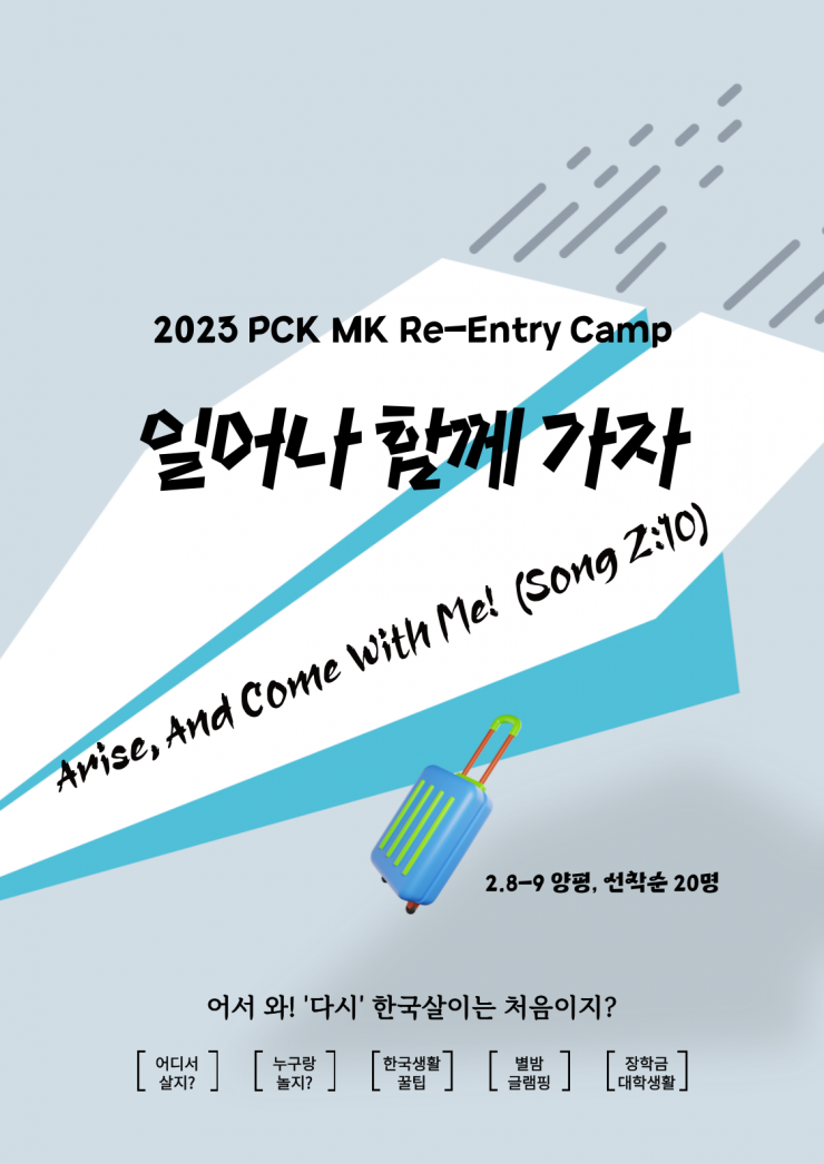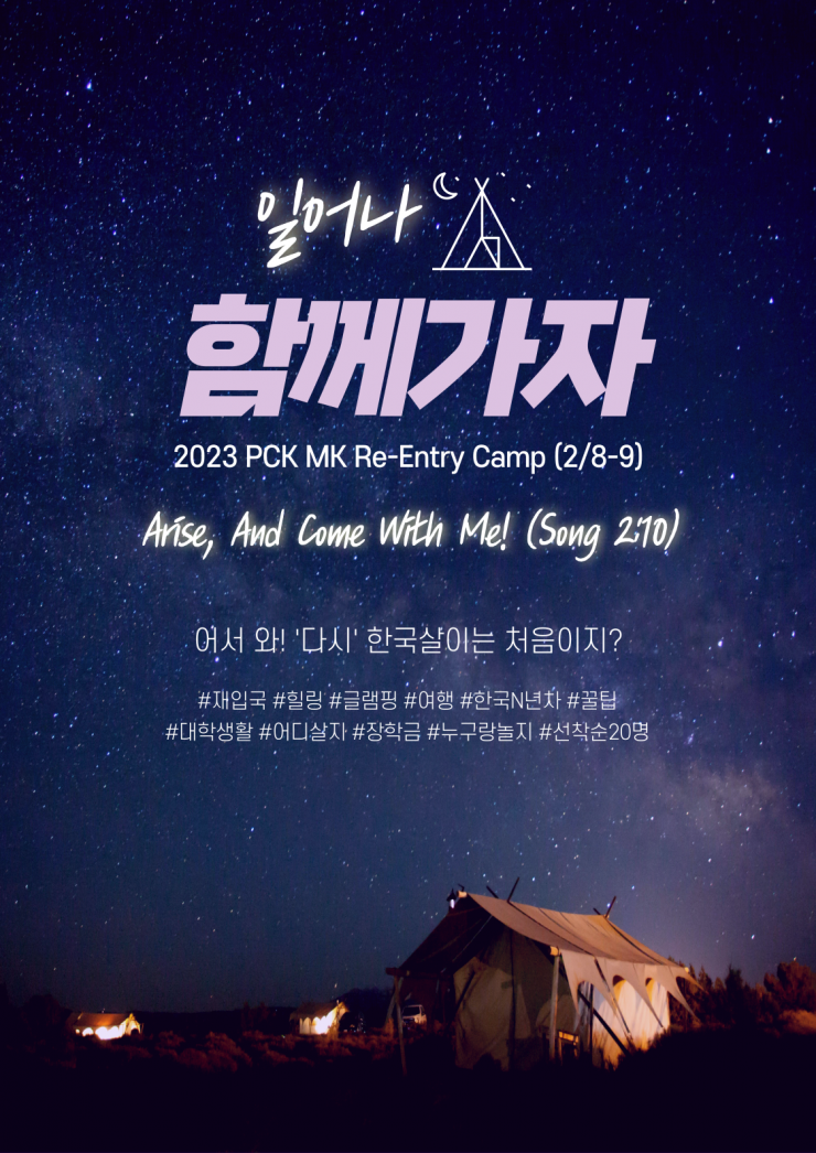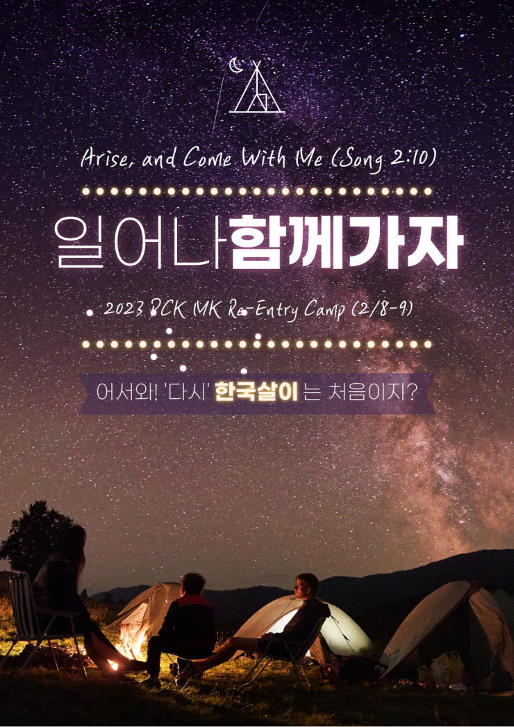 2023년 2월 8일(수) - 9일(목) 1박 2일의 일정으로 선교사자녀 재입국(RE-ENTRY) 캠프가 열립니다. 아래 내용을 확인하여, PCM MK 중 2023 재입국캠프에 참여하기 원하는 MK는 신청해 주세요. 1.목적: 재입국 선교사자녀들의 역 문화충격을 최소화하고, 한국사회에 잘 적응하고 성장할 수 있는 장을 마련한다. 1) 선교사자녀 네트워크를 형성하여 선교사자녀 상호 간에 돌봄과 상담, 교회 연결, 학업도움 등이 가능하게 한다. 2) 대학생활을 시작하는 새내기 선교사자녀에게 필요한 한국 생활정보와 노하우를 전달한다. 3) 재입국한 선교사자녀를 위해 기도하고 지원하는 총회와 한국교회가 있음을 알림으로써, 선교사자녀로서의 정체성과 하나님자녀로서의 신앙을 갖고 살게 한다. 2. 주제: 일어나 함께 가자! (Arise, And Come With Me!) 3. 주제말씀: "나의 사랑, 내 어여쁜 자야 일어나서 함께 가자" (아가서 2장 10절) 4. 일정: 2023년 2월 8일(수) ~ 9일(목) 1박 2일 5. 장소: 더 큰 나무 펜션 (경기도 양평군 용문면 조계골길 121) - 특별한 경우를 제외하고, 서울(종로)에 모여서 함께 출발합니다. 6. 참가비: 2만원 7. 대상: PCK MK로 아래에 해당하는 사람(선착순 20명 제한) 1) 2023년 국내 대학 입학 예정인 MK 2) 2023년 현재 국내 대학 1-2학년 재학 또는 휴학 중인 MK 3) 1)과 2)에 해당되지 않으나 국내에 입국한 지 1년 이내인 MK 4) PCK MK 재입국 캠프에 참여한 경험이 없는 MK 8. 한국생활 꿀팁(대학생활, 친구 교제, 장학금, 숙소, 알바, 신앙생활 등 꼭 필요한 유용한 정보) 안내와 MK Talk, 글램핑, BBQ, 디브리핑, QT, 마음훈련, 소그룹 나눔 등 다양한 활동이 있습니다. 9. 준비물: 성경책, 개인세면도구