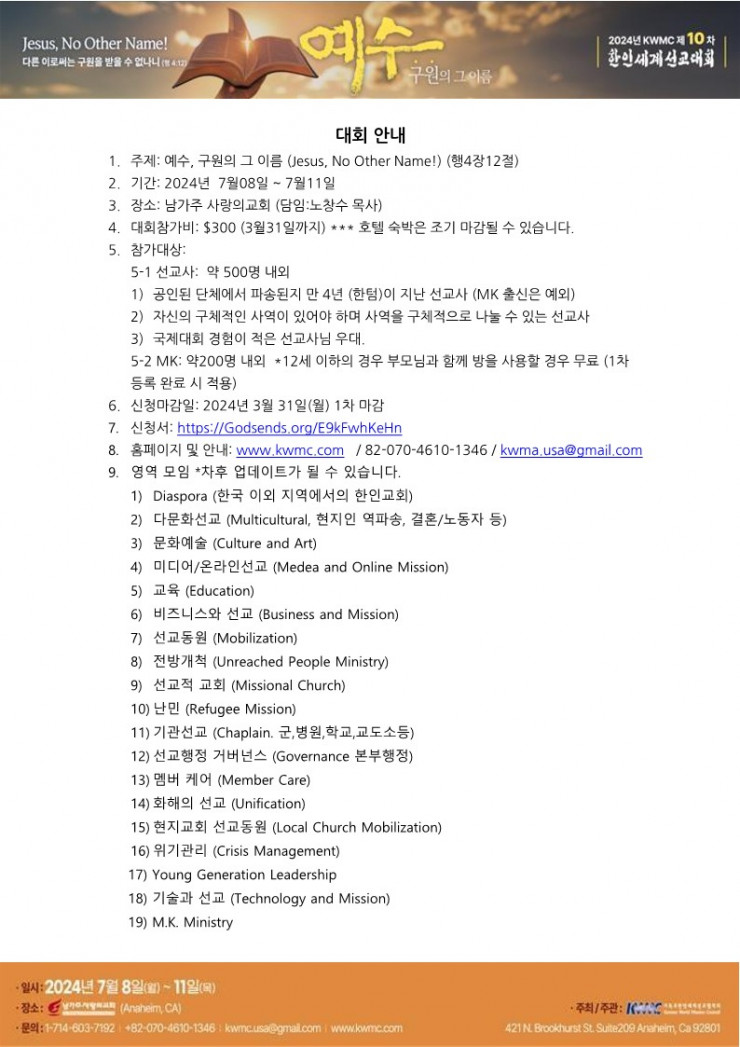[외부세미나] 제10차 한인세계선교대회_기독교한인세계선교협의회(KWMC)하나님의 크신 은혜가 함께 하시기를 기도합니다. 기독교한인세계선교협의회(KWMC)는 2024년 7월 8일부터 11일까지 미국 LA에 위치한 남가주 사랑의 교회에서 예수 구원의 그 이름(Jesus, No Other Name!)이라는 제목으로 제10차 한인세계선교대회를 준비 중에 있습이다. 선교대회 참가자중 선교사를 500여명으로 한정하여 초청하고자 합니다.
