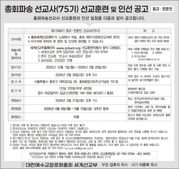 총회파송 정규/전문인 선교사 선교훈련 및 인선을 공고합니다.