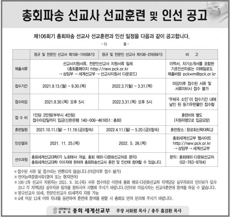 제106회기 총회파송선교사 선교훈련 안내 (68기, 69기)