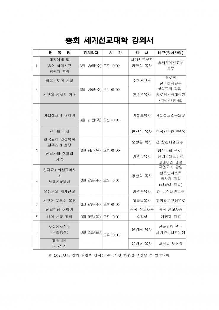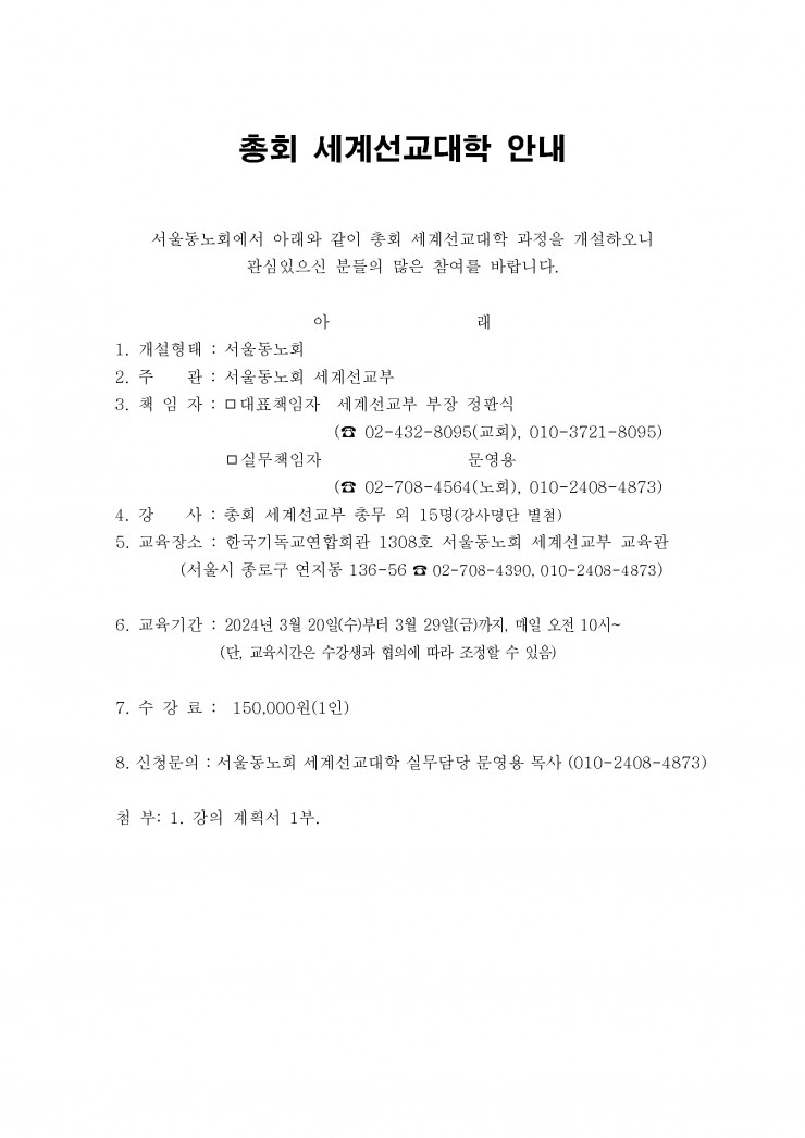 총회세계선교대학 개설안내(2024.3.20.~29. / 서울동노회)
