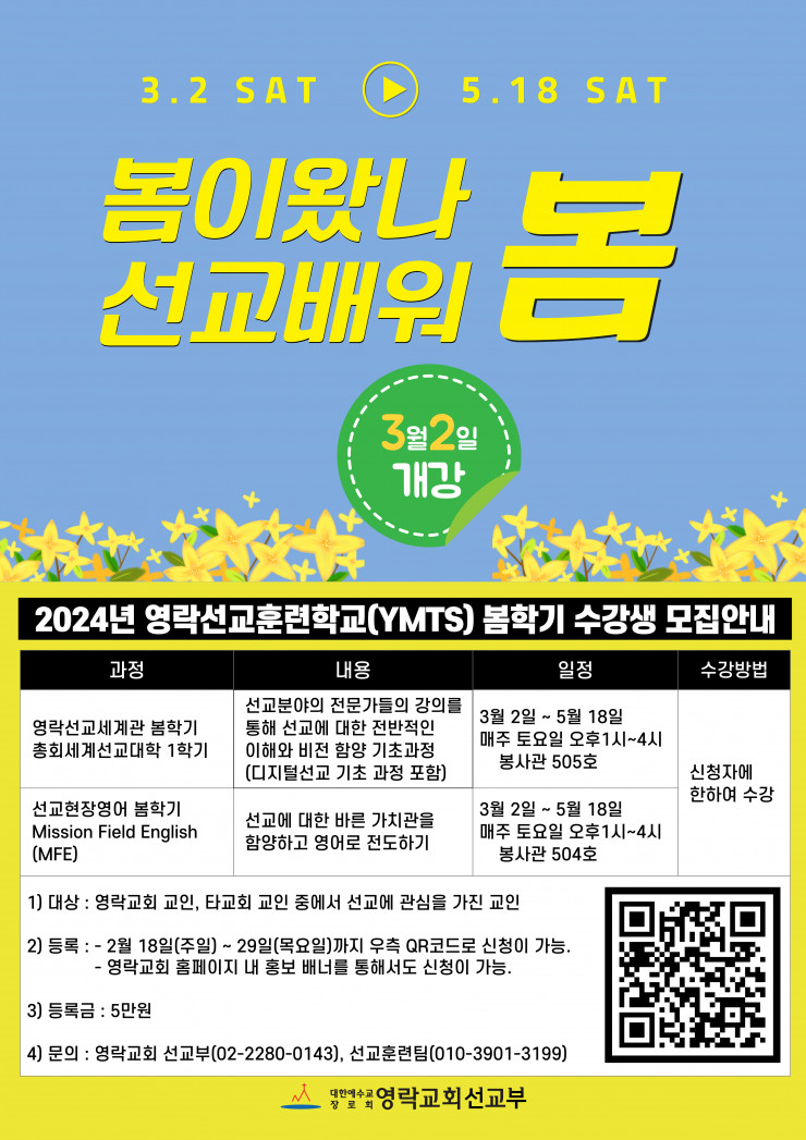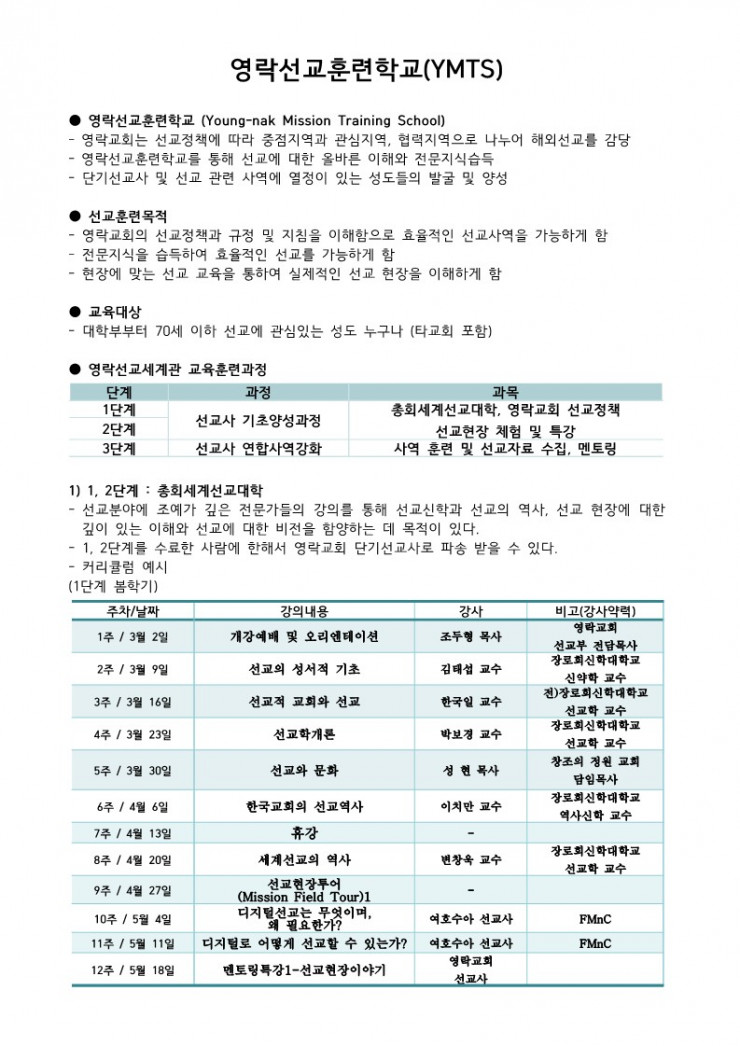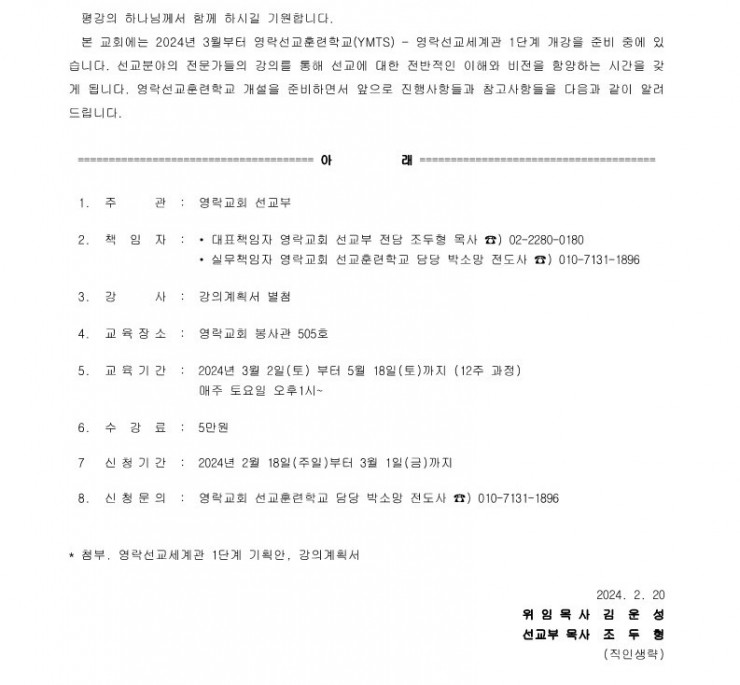 총회세계선교대학 개설안내(2024.3.2.~5.18 / 영락선교훈련학교)