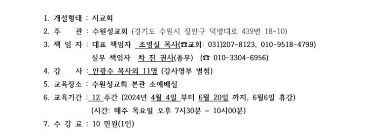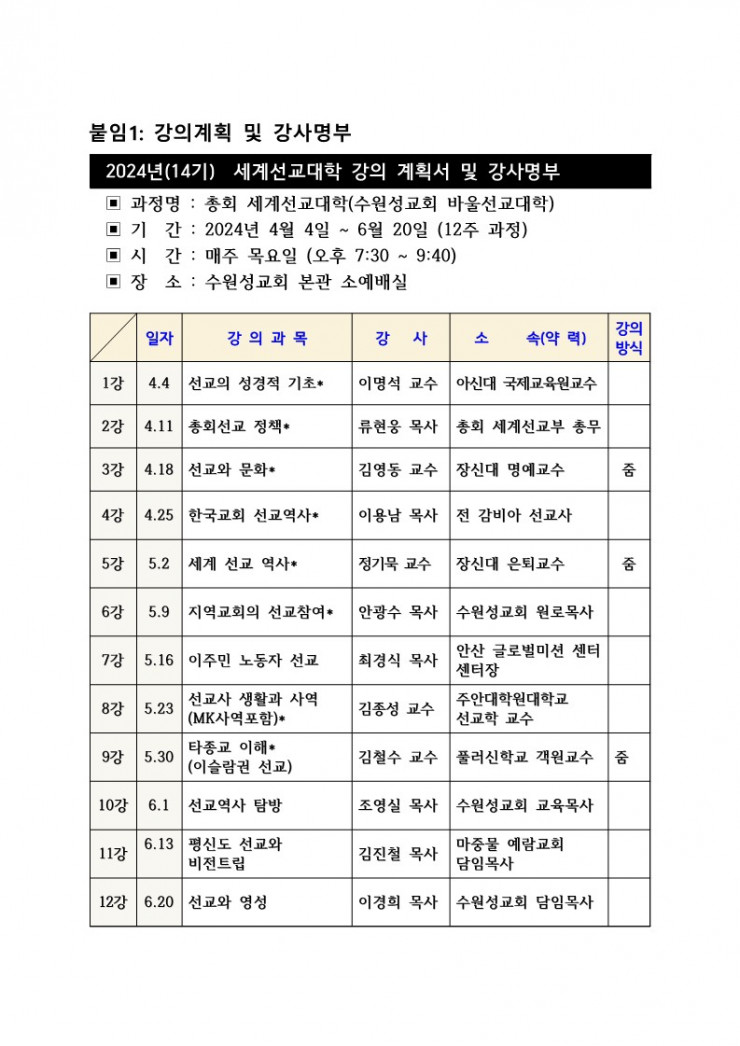 총회세계선교대학 개설안내(2024.4.4.~6.20 / 수원성교회 바울선교대학)