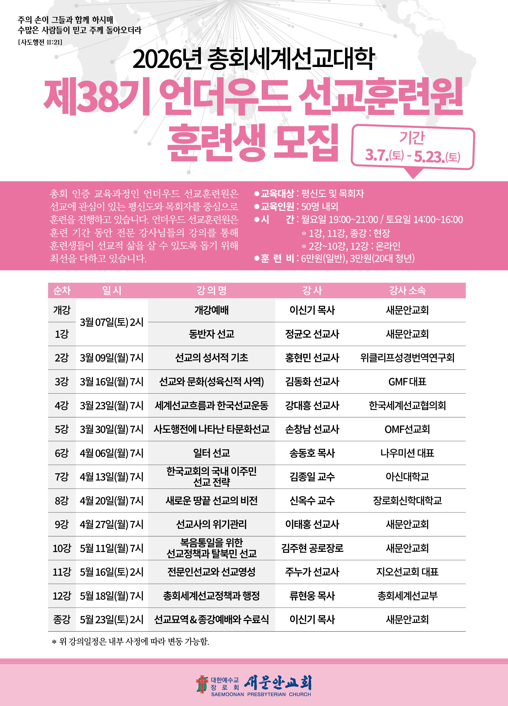 총회세계선교대학 개설안내(2026.3.7.~5.23. / 새문안교회 언더우드 선교훈련원)