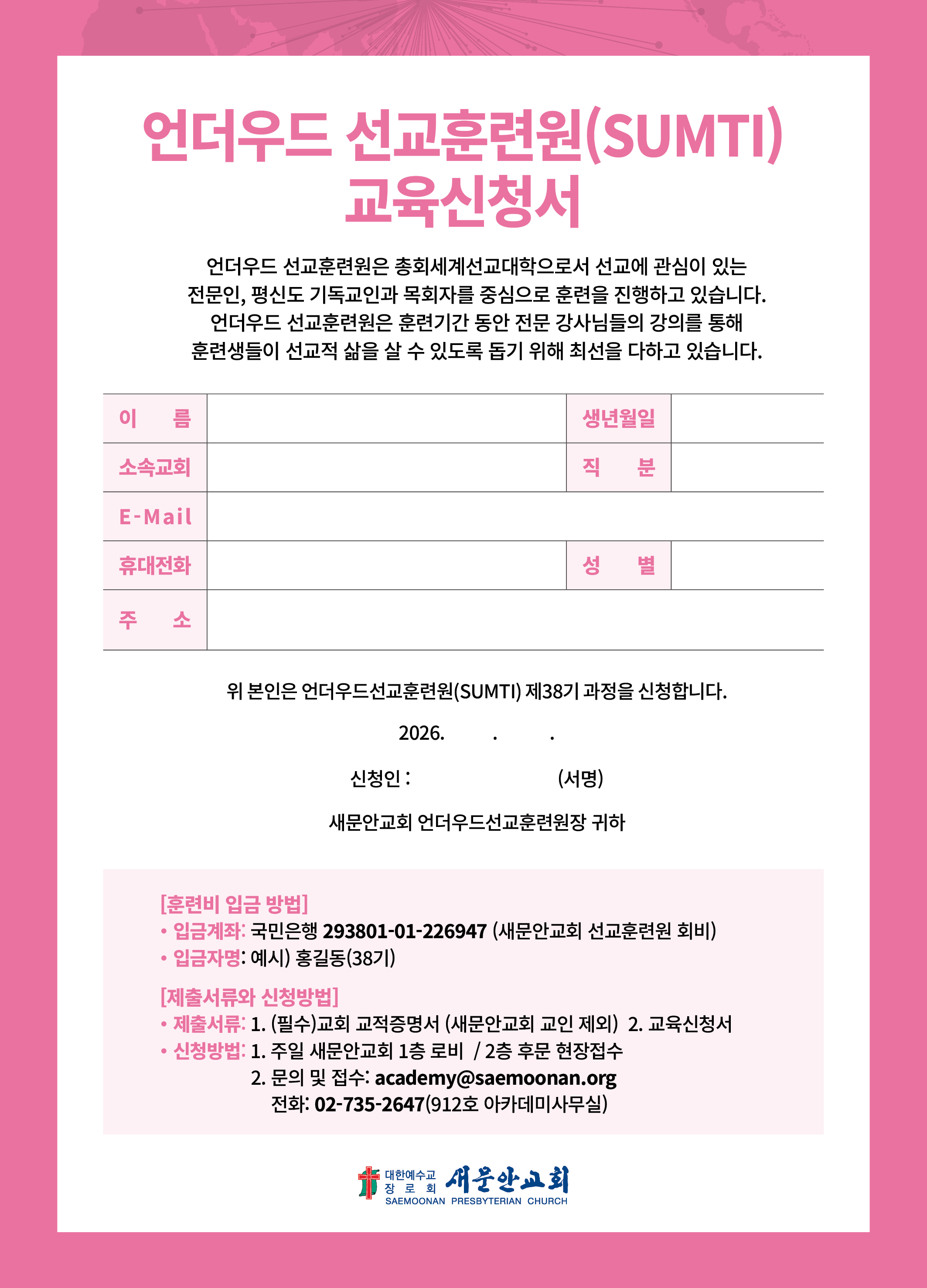 제 38기 새문안교회 언더우드 선교훈련원 훈련생 모집합니다.