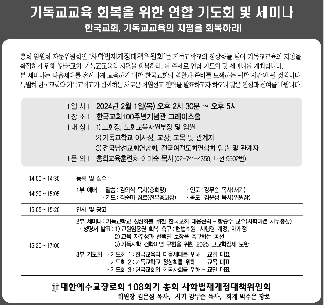 총회 임원회 자문위원회인 ‘사학법재개정대책위원회’는 기독교학교의 정상화를 넘어 기독교교육의 지평을 확장하기 위해 ‘한국교회, 기독교교육의 지평을 회복하라!’를 주제로 연합 기도회 및 세미나를 개최합니다. 본 세미나는 다음세대를 온전하게 교육하기 위한 한국교회의 역할과 준비를 모색하는 귀한 시간이 될 것입니다. 특별히 한국교회와 기독교학교가 함께하는 새로운 학원선교 전략을 발표하고자 하오니 많은 관심과 참여를 바랍니다.