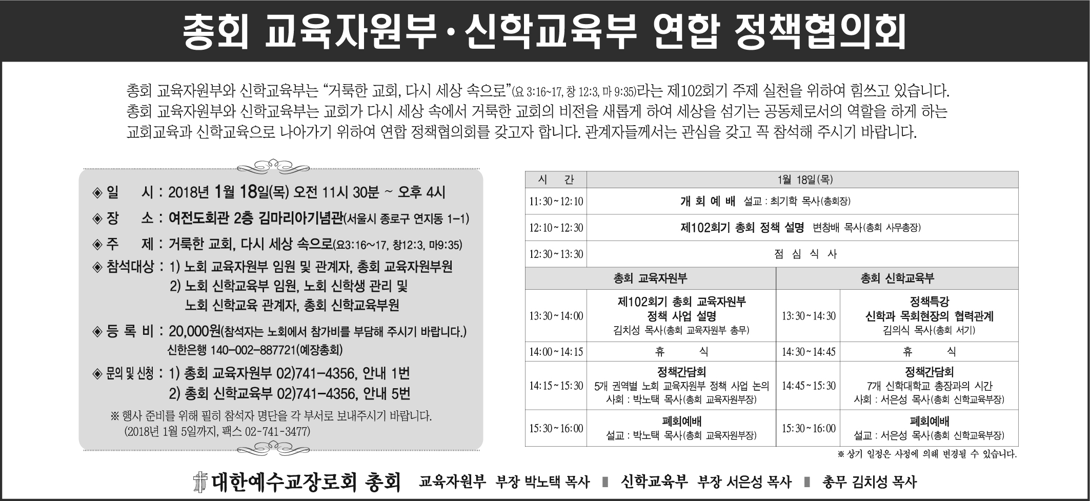 총회 교육자원부와 신학교육부는 교회가 다시 세상 속에서 거룩한 교회의 비전을 새롭게 하여 세상을 섬기는 공동체로서의 역할을 하게 하는 교회교육과 신학교육으로 나아가기 위하여 연합 정책협의회를 갖고자 합니다. 관계자들께서는 관심을 갖고 꼭 참석해 주시기 바랍니다.