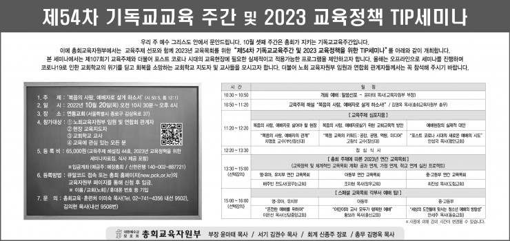 10월 셋째 주간은 총회가 지키는 기독교교육주간입니다. 이에 총회교육자원부에서는 교육주제 선포와 함께 2023년 교육목회를 위한 "제54차 기독교교육주간 및 2023 교육정책을 위한 TIP세미나"를 아래와 같이 개최합니다. 본 세미나에서는 제107회기 교육주제와 더불어 포스트 코로나 시대의 교육현장에 필요한 예배의 실제적이고 적용가능한 프로그램을 제안하고자 합니다. 올해는 오프라인으로 세미나를 진행하며 코로나19로 인한 교회학교의 위기를 딛고 회복을 소망하는 교회학교 지도자 및 교사들을 모시고자 합니다. 더불어 노회 교육자원부 임원과 연합회 관계자들께서는 꼭 참석해 주시기 바랍니다.