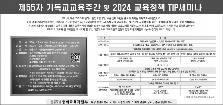 10월 셋째주간은 총회가 지키는 기독교교육주간입니다. 이에 총회교육자원부에서는 교육주제 선포와 함께 2024년 교육목회를 위한 “제55차 기독교교육주간 및 2024 교육정책을 위한 TIP세미나”를 아래와 같이 개최합니다. 본 세미나에서는 제108회기 교육주제와 더불어 교육현장에 필요한 실제적이고 적용가능한 프로그램을 제안하고자 합니다. 이에 교회학교의 위기를 딛고 회복을 소망하는 교회학교 지도자 및 교사들을 모시고자 합니다. 더불어 노회 교육자원부 임원과 연합회 관계자들께서는 꼭 참석해 주시기 바랍니다.