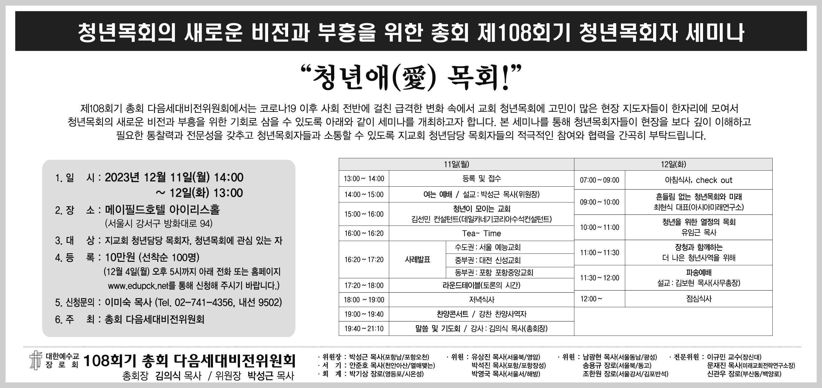 제108회기 총회 다음세대비전위원회에서는 코로나 19 이후 사회전반에 걸친 급격한 변화 속에서 교회 청년목회에 고민이 많은 현장 지도자들이 한자리에 모여서 청년목회의 새로운 비전과 부흥을 위한 기회로 삼을 수 있도록 아래와 같이 세미나를 개최하고자 합니다. 본 세미나를 통해 청년목회자들이 현장을 보다 깊이 이해하고 필요한 통찰력과 전문성을 갖추고 청년목회자들과 소통할 수 있도록 지 교회 청년담당 목회자들의 적극적인 참여와 협력을 간곡히 부탁드립니다.