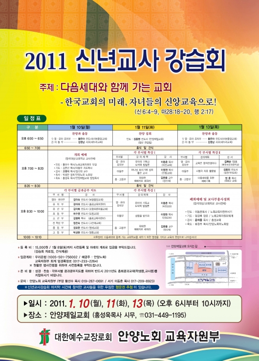 샬롬! 하나님의 은혜와 사랑이 섬기시는 교회와 가정 위에 항상 함께 하길 기도드립니다. 안양노회 교육자원부(영유아.유치부,아동부,중고등부) 에서는 2011년 신년교사강습회를 2011. 1. 10(월),11(화),13(목) 오후 6시~10시까지 안양제일교회에서 개최합니다. 교사분들의 많은 참여와 기도 부탁드립니다.