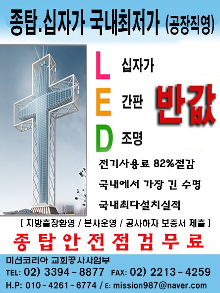 ● 종탑, 안전점검 무료 (태풍대비) ※ 안전검검 의무화 (1년 1회이상) ● LED십자가,간판 반값!! (공장직거래) ● 전기 사용료 82% 절감 ● 이메일 견적 접수 환영 mission987@naver.com ● 지방출장공사 대 . 환 . 영 (견적비용없음) ● 특수 종탑 제작 전문 - 미션코리아 교회사업부- 대표전화: 02-3394-8877 FAX: 02-2213-4259 010-2351-6771