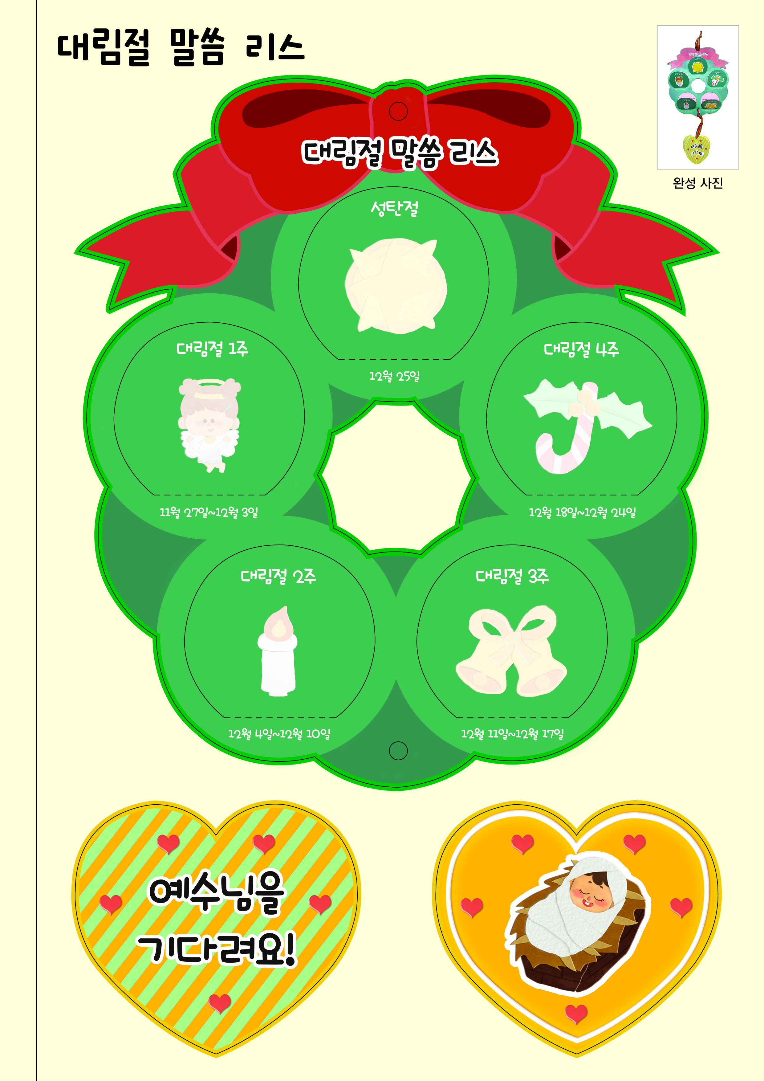 유치부 2-2 지도자 '대림절 말씀 리스'내의 오류를 발견하여 수정해서 다시 올립니다. 필요하신 분들은 마우스 우클릭 후 다운받아 사용하세요. 감사합니다.
