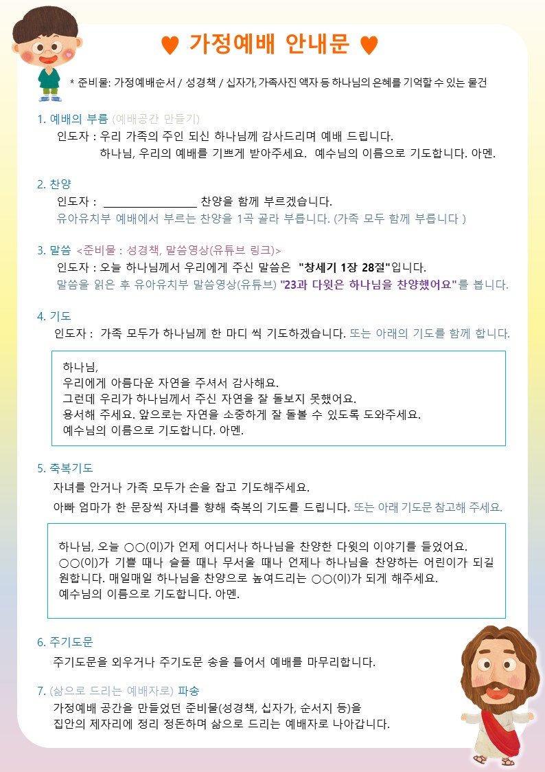 이에 따라 6월 한 달 동안 가정예배지를 제공하오니 파일은 내려받으셔서 참고하시기 바랍니다.