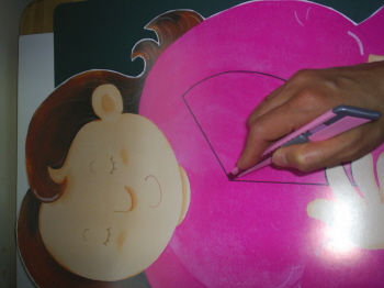 16-4 엄마 그림에 있는 긁은 선부분을 칼로 오려낸다.