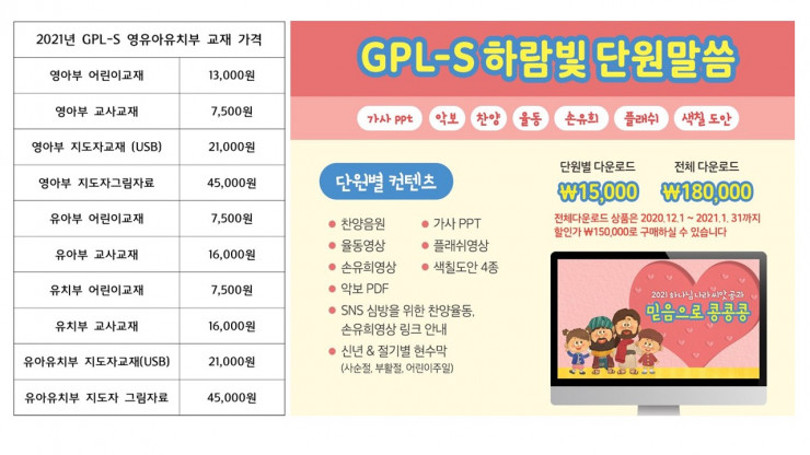 2021년 GPL-S 영유아유치부 공과 홍보영상과 교재가격입니다.