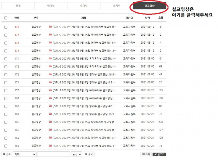 설교영상은 위의 영아부/유아부/유치부 게시판 옆 "설교영상" 게시판에 올려집니다.