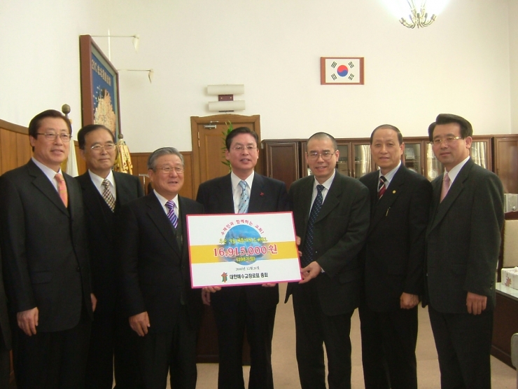 충청노회 노회장 김완식 목사, 사회봉사부장 이준필 목사, 총무 엄주성 목사