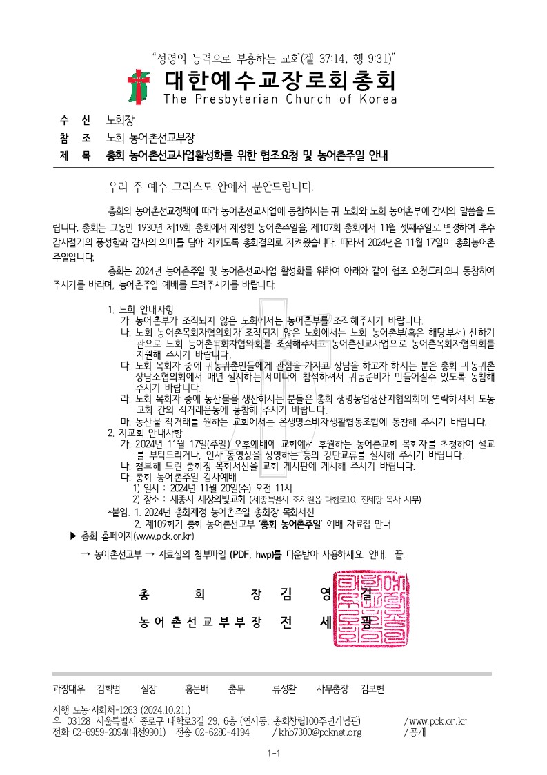 [농어촌선교자료] 총회 농어촌선교사업활성화를 위한 협조요청 및 농어촌주일 안내 공문