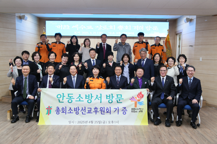 총회 군경교정선교부 부장 이상근 목사를 비롯한 임원단과 소방선교후원회 회장 박요셉 목사와 명예회장 이순창 목사 등 임원단은 이날 대형산불이 발생한 안동 지역에서 인명 구조와 화재 진압에 임한 안동소방서를 방문해 소방공무원을 위로하고 격려했다. 후원회는 이날 소방관들이 무더위를 이겨낼 수 있도록 제작된 쿨링 기능을 갖춘 티셔츠 300장과 롤케이크 300개를 전달했다.