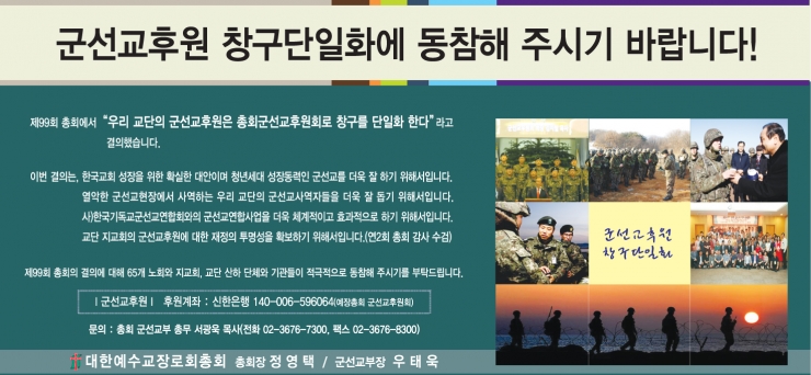 제99회 총회 결의사항인 "군선교후원 창구 단일화" 에 대한 기독공보 광고입니다.