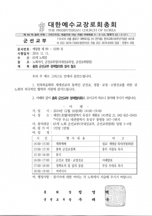 일 시 : 2014년 12월 16일(화) 14:00-19:00장 소 : 레전드호텔(대전광역시 유성구 계룡로 141번길 21, 042-825-0545) *이전 주소) 대전광역시 유성구 봉명동 547-5번지참석대상 : 65개 노회 군선교부(국내선교부, 군선교위원회) 임원 3-4명참 가 비 : 1인당 1만원일 정 : 공문참조행정사항 : 참가자에 대한 여비는 각 노회에서 지급해 주시기 바랍니다.