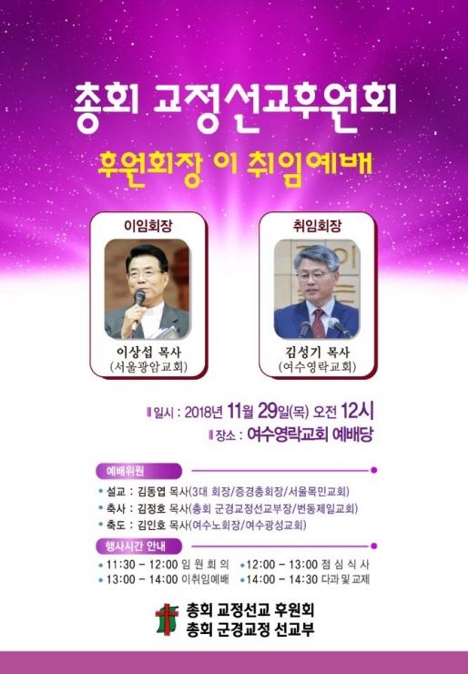 총회교정선교후원회 회장 이취임식예배가 아래와 같이 있습니다.