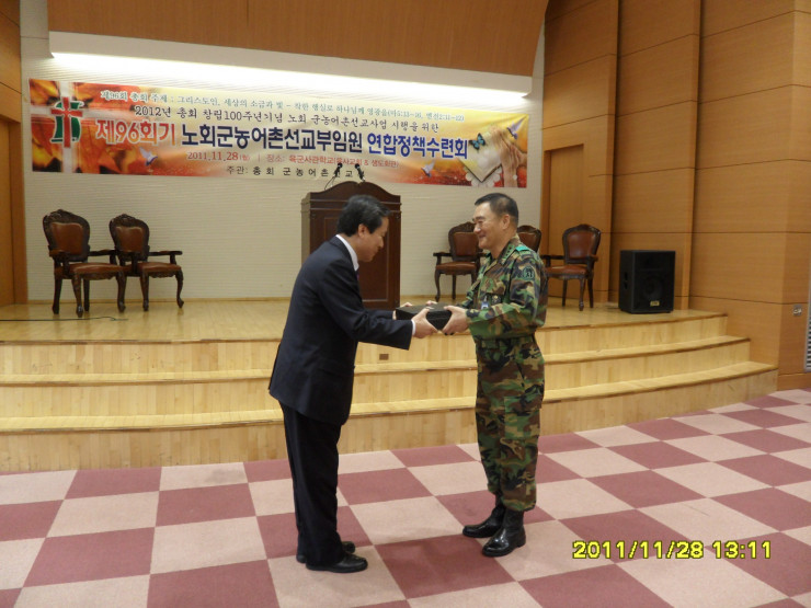 부장 신정호 목사가 육군사관학교장에게 기념품 증정