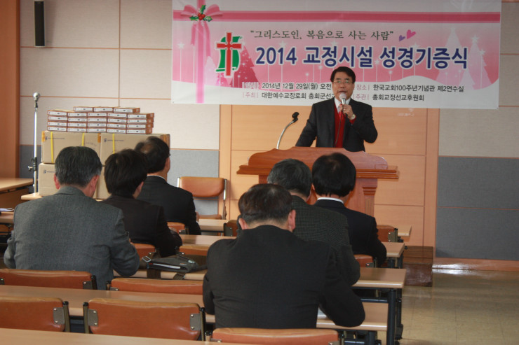 일시 : 2014년 12월 29일(월) 오전11시장소 : 100주년기념관 제2연수실내용 : 교정시설 성경전달후원 : 광암교회, 동신교회, 예닮교회, 미래로교회, 국제사랑재단, 하늘담은교회기증대상 : 광주교도소, 국군교도소, 서울남부교도소, 순천교도소, 포항교도소(이상 5개교정시설)