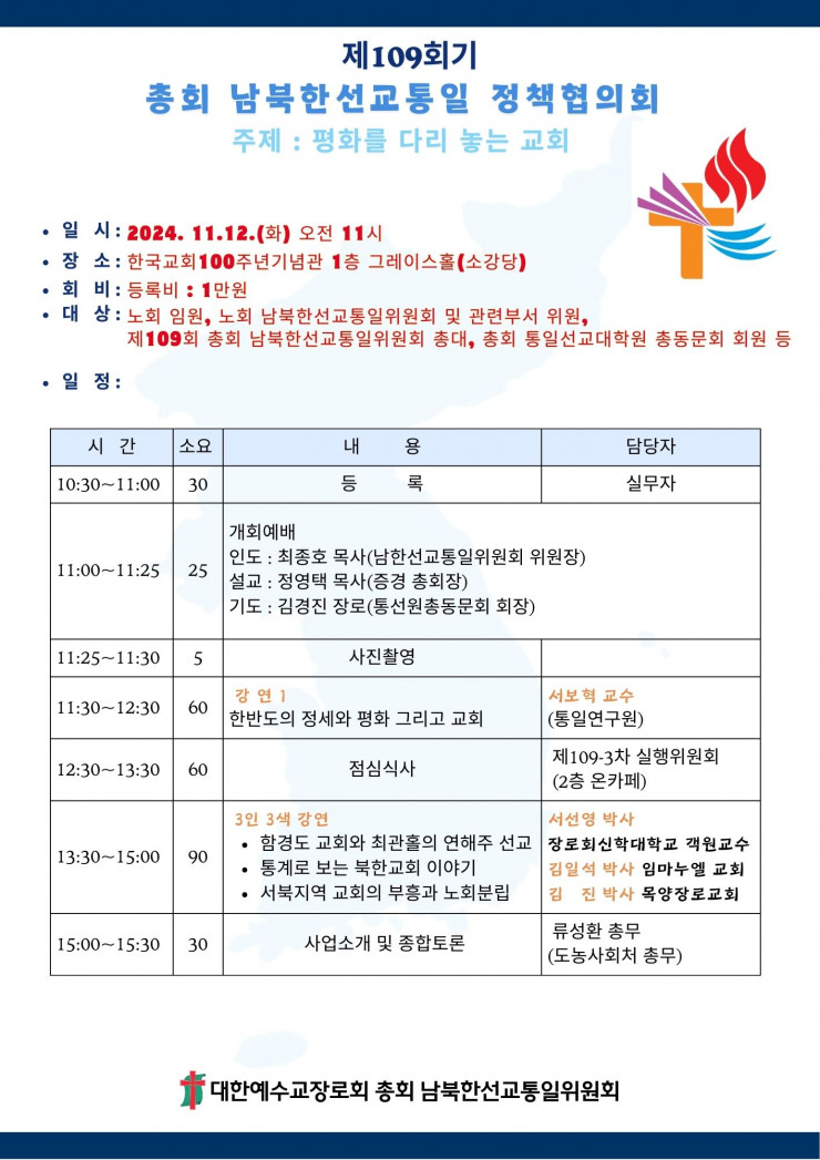 제109회기 총회 남북한선교통일 정책협의회(11.12(화)오전11시 한국교회백주년기념관)