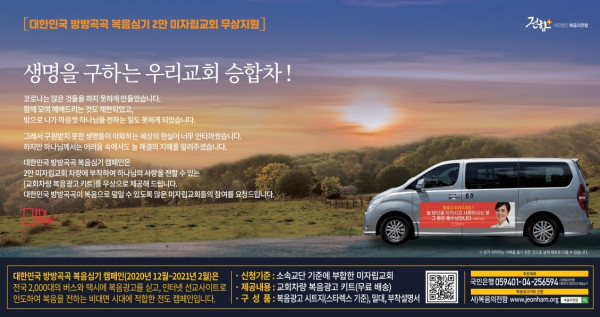 행사 내용 : 1) 복음광고 이미지를 전국 시내버스 및 택시 2,000대에 부착하고 광고한 것에 이어서 교회 외벽과 교회 차량에 동일한 이미지를 부착하는 비대면 전도방법을 통해 코로나 시대에도 복음전파의 사명을 감당 2) 자립교회는 사)복음의전함 홈페이지를 통해 원하는 사이즈를 신청하여 이미지파일을 무료로 수령하여 주거래 출력소에서 출력하여 외벽 또는 차량에 부착 3) 미자립교회는 사)복음의전함 홈페이지를 통해 스타렉스 측면 도어에 맞는 사이즈(120x40cm)의 접착시트지를 신청하여 무료로 수령하여 직접 부착 (상세 내용은 복음의전함 홈페이지를 참조 www.jeonham.org)