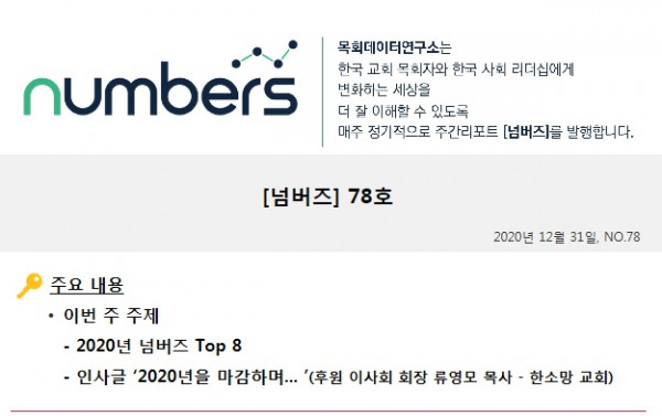 작년과 마찬가지로 [넘버즈] 2020년 마지막 호는 올 한해 독자들의 반응이 높았던 콘텐츠 중 ‘기독교’, ‘일반사회’, ‘다음세대’, ‘트렌드 분야’로 나누어 8개를 뽑아 정리하였습니다.