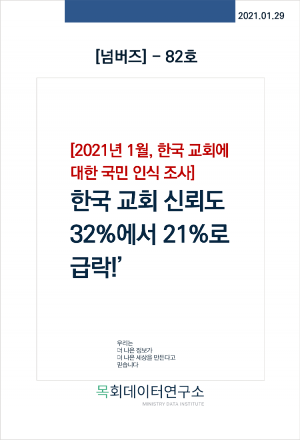 1년 후인 2021년 1월 동일한 문항으로 조사한 한국 교회 신뢰도(목회데이터연구소)는 21%로 1년간 무려 11%p가 하락한 것으로 나타났습니다.