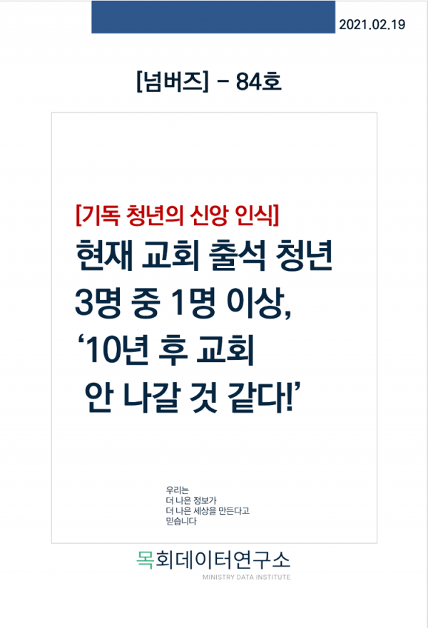 목회데이터연구소 [넘버스] 제 84호에서는 ‘기독 청년의 사회 의식’을 다룬 83호에 이어 ‘기독 청년의 신앙 의식’을 다루었습니다. 기독 청년의 신앙 의식이 어떻게 형성되었는지, 그들의 신앙적 특징은 무엇인지, 코로나19 상황에서 온라인 예배는 어떻게 드리고 있는지 등을 종합적으로 분석했습니다.
