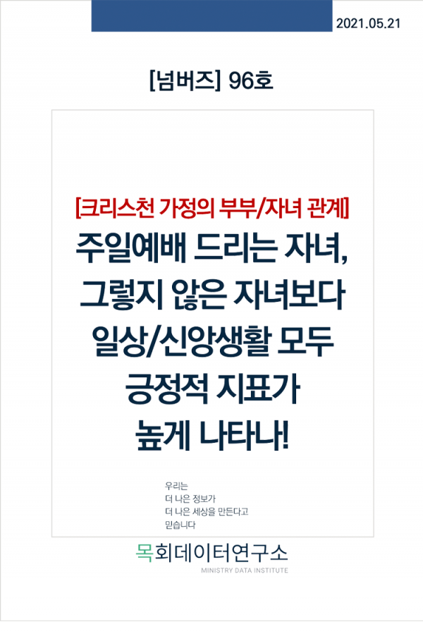 제목 : 주일예배 드리는 자녀, 그렇지 않은 자녀보다 일상/신앙생활 모두 긍정적 지표가 높게 나타나!