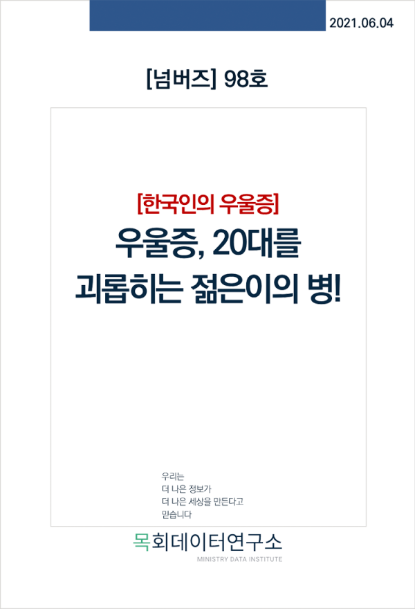 이번 목회데이터연구소 [넘버즈] 98호는 우울증의 통계 수치와 그 수치에서 드러나고 있는 청년들의 우울 증세 증가 현상, 그리고 이로 인한 청년들의 자살 시도자 급증 현상 등 우리 사회와 한국 교회가 돌아봐야 할 아픈 지점을 다루어 보았다.