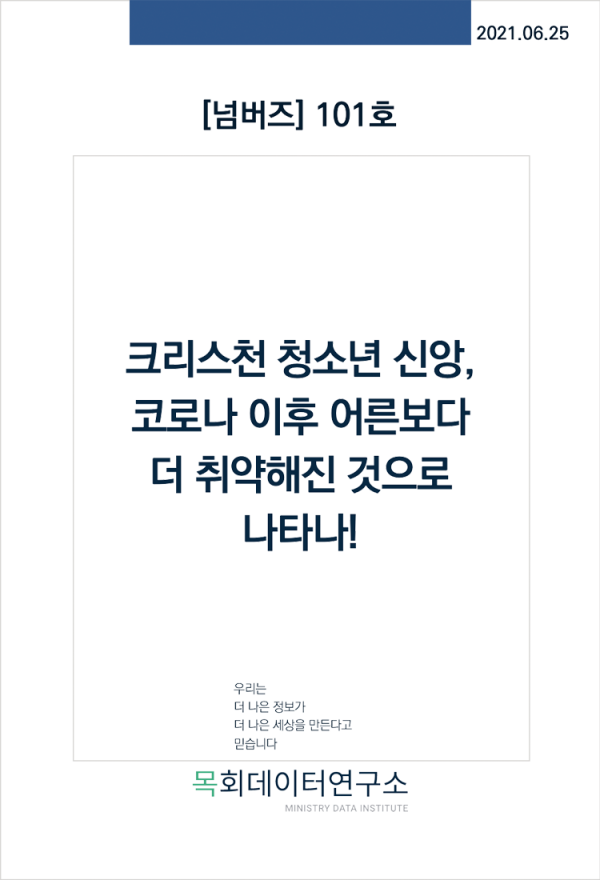 이러한 배경 하에서 코로나19 이후 크리스천 청소년이 어떻게 신앙생활을 하고 있으며, 이들의 신앙 활동 및 인식이 어떻게 변화되고 있는지 파악할 수 있는 최근 조사 결과가 발표되었는데, 이번주와 다음주 2회에 걸쳐 주요 결과를 소개한다. 포스트 코로나 시대에 각 교회별 다음세대 전략을 수립하는 데 도움이 되길 바란다.